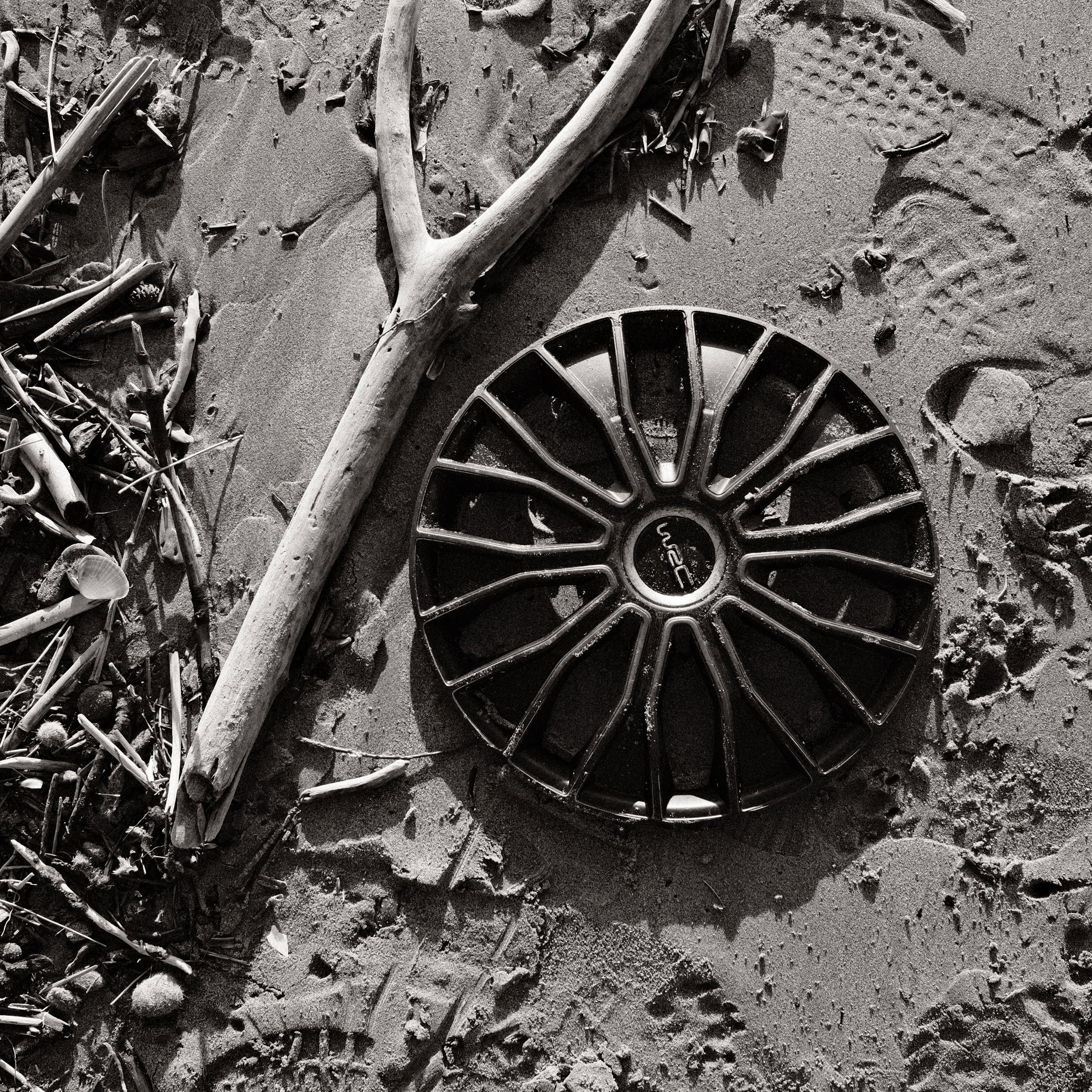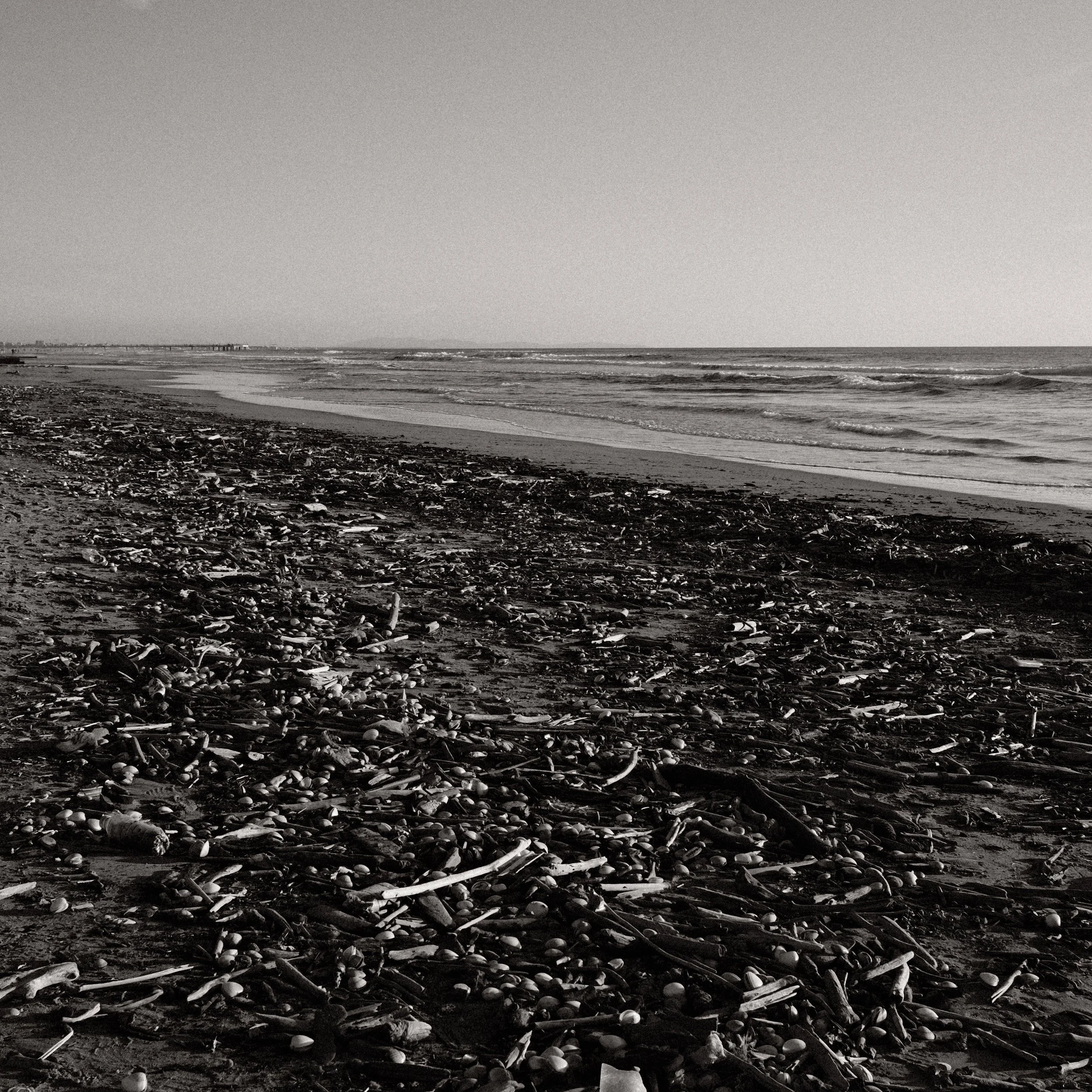 Objects dominate the beach because no one is really looking at them. A half-buried seashell becomes a monument. Nothing else is required. It’s perfect as it is. Empty. Worn down. Useless. A whole universe that decided to make itself small. In a space large enough, everything matters for five minutes. Then a wave comes in and resets the system.